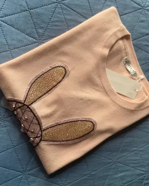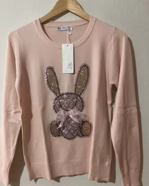 Sueters ligero moderno. Sueters ligero en color rosa con conejo al frente en brillos, talla unitalla
