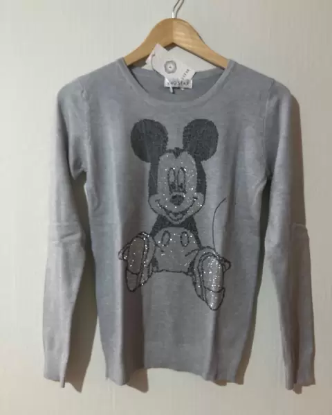 Sueters moderno ligero. Suéter ligero en color gris con estampado en brillos de mickey en unitalla