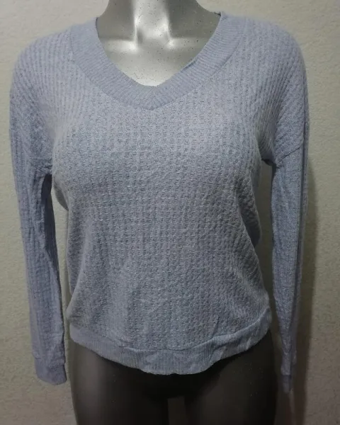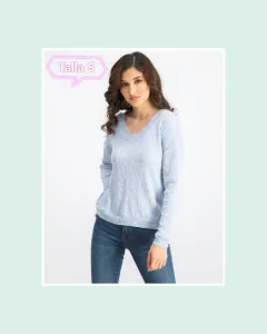 Hermosos suetersito delgadita azul celeste, el hilo da un brillo, que da sotisficacion al suéter. Medidas largo 57cm, axila a axila 52cm, largo Manga 48cm