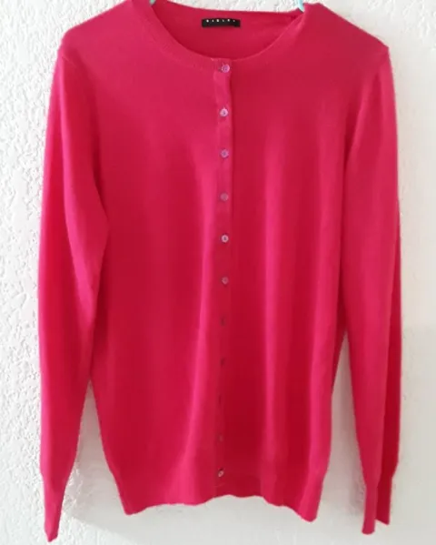 XL A estrenar sin etiqueta SisleyDescripción:Sweater rosa fresa, comodo, calientito. Medidas en fotos. Viene reforzado x dentro los botones con una tira de tela . Dice talla XL pero tambien para talla G o L esta perfecto