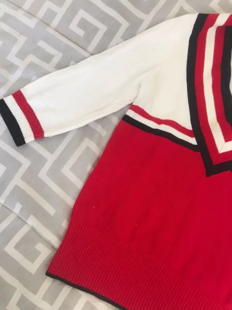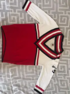 Sweter hermoso de punto deportivo. Hermoso sweter manga 3/4 blanco , azul y rojo franjas cuello en V de punto deportivo tipo Polo , tipo tennis talla xS queda perfecto S , marca Áms Blaws
