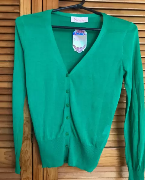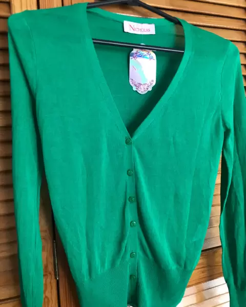 Sweter nicholas verde. Hermoso suéter en cuello v y botones. La tela es delgadita pero estira. Está bperfecto para un look casual o un vestido. Mide de axila a axila 40 cm sin estirar
