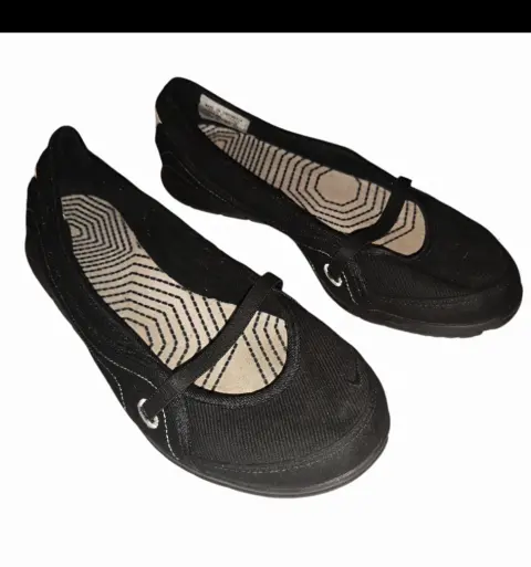 Lindos flats Nike , color negro en perfecto estado, han estado guardadas se utilizaron en una ocasión no tienen ningún detalle. tienen un tipo correa elastico que se adapta perfecto .el tamaño de la suela es 26 cmEl material es textil