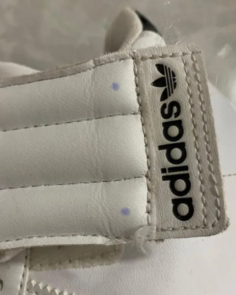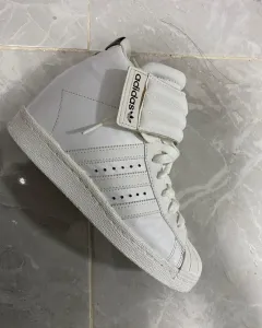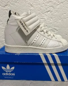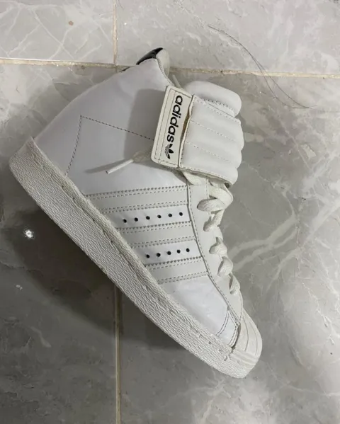 Tenis blancos marca Adidas de bota, cuentan con plataforma. Tienen sólo dos pequeños detalles, uno es que ya se está despegando una parte del broche y el otro es que tiene dos puntitos azules como se aprecia en la imagen, son tenis con muy poco uso. Están súper bonitos no te arrepentirás 💕