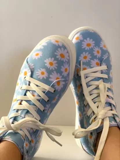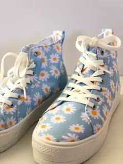 Tennis estilo bota con plataforma ligeramente. Estampado de flores blancas, color baby Blue de fondo. Son nuevos y están preciosos!