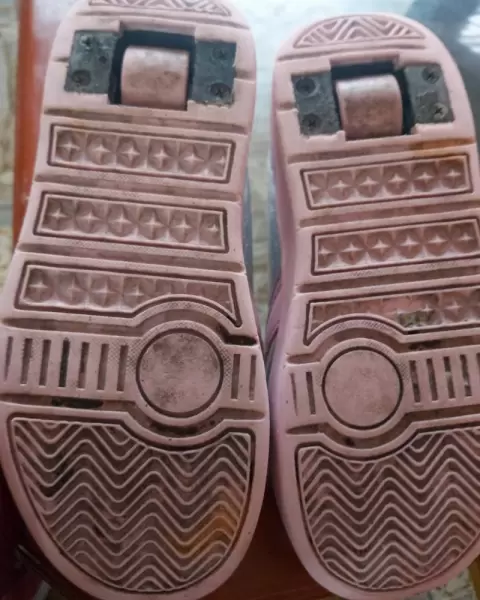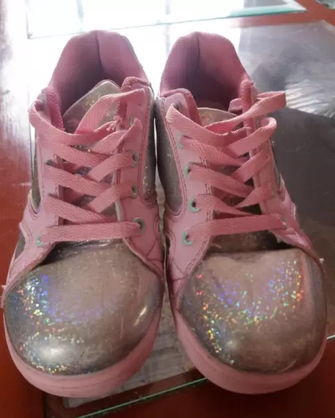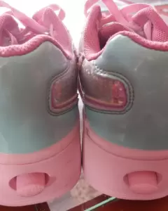 Tenis patín color tornasol con verde agua con agujetas rosas forro rosa con 1 ruedita cada tenis muy cómodo para ir de paseo no estan rrotos ni sucios son de talla 22 cm