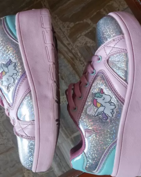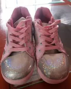 Tenis casuales tornasol. Tenis patín color tornasol con verde agua con agujetas rosas forro rosa con 1 ruedita cada tenis muy cómodo para ir de paseo no estan rrotos ni sucios son de talla 22 cm