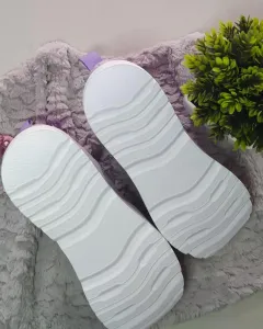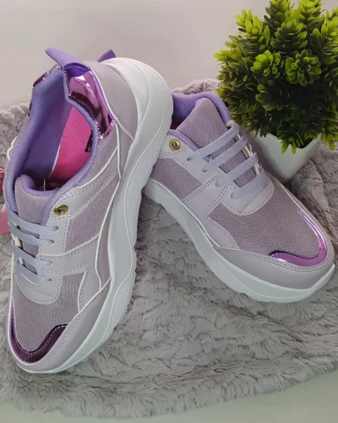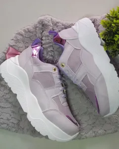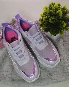 Tenis con plataforma blanca talla 24, color lila y vivos morado brilloso. Agujetas lila.