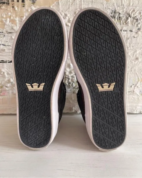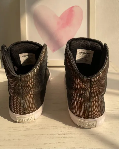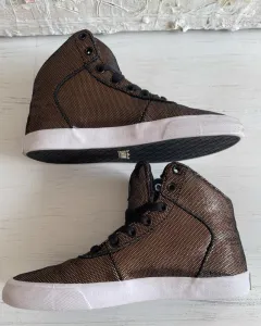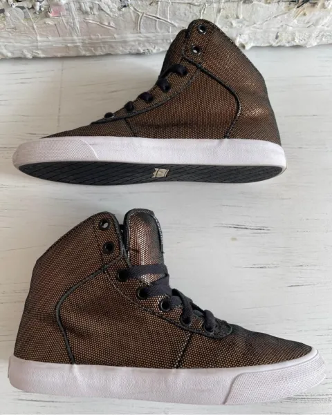 Tenis de bota dorados tornasol Supra. Talla: 23.5 cm, tipo bota, dorados tornasol, fieles a su talla. No tienen detalles.