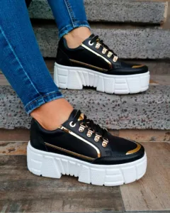 Tenis de plataforma. Super cómodos y ligeros.no pesan nada..negros con aplicaciones doradas,aritos de metal para cordónes.