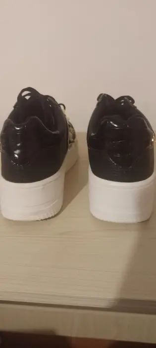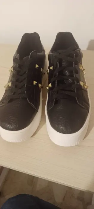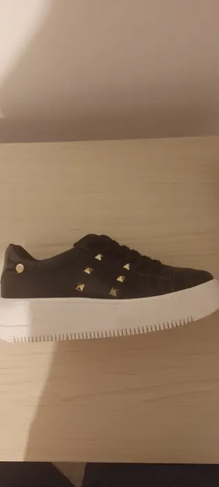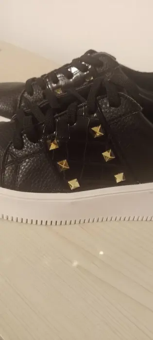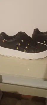 Tenis color negro de plataforma con detalles de piel charol con estoperoles, la plataforma es de 4cm de alto.