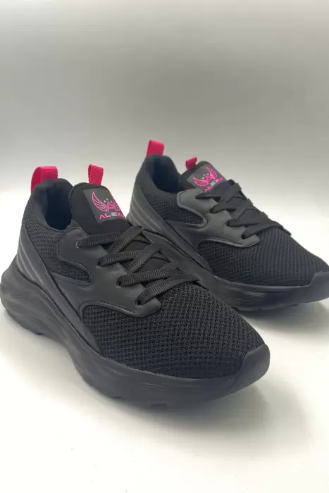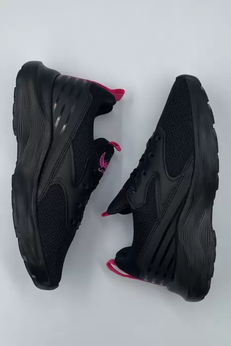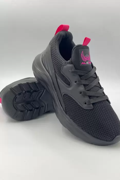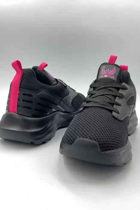 TENIS PARA DAMA. Para esas rutinas de ejercicio que tienes, lo mejor es realizarlas con estos cómodos tenis que diseñó la marca AlexiaEs un calzado deportivo fabricado con materiales 100% sintéticos, por lo que son durables y resistentes, además poseen una suela ligera por lo que tus pisadas están seguras. Su diseño es de color negro con detalles en rosa, para darte un mejor ajuste tienen agujetas al frente.