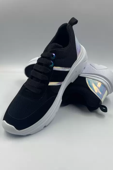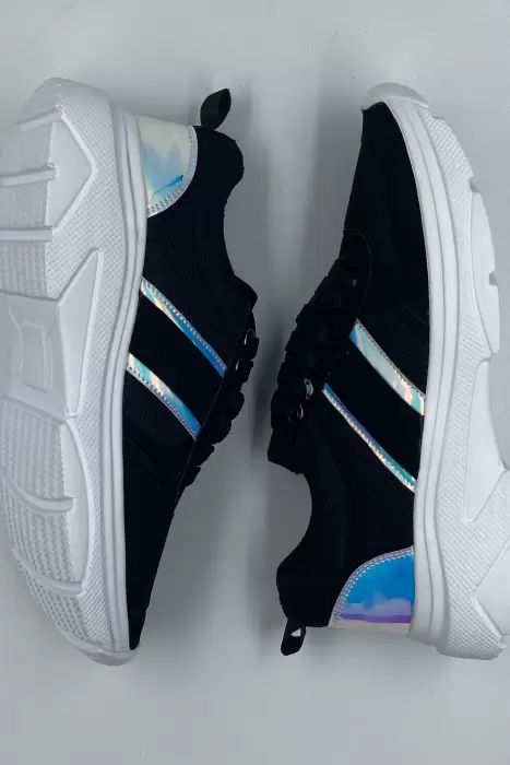 TENIS PARA DAMA. Si una cosa queda clara es que estos tenis te ponen al instante en sintonía con la moda. ¡Son unos sneackers imprescindibles!Por su color negro y detalles tornasol en el corte se convierten en objeto de deseo. Están fabricados con materiales textiles para mantener tus pies frescos.