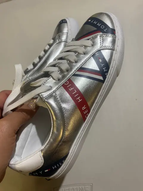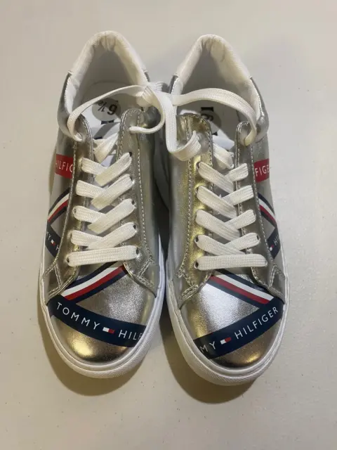 TENIS PLATA TOMMY HILFIGER no 23.5. TENIS PLANOS COLOR PLATA CON MARCA EN ROJO Y AZUL, su estampado los hace llamativos. Totalmente nuevos sin detalles, no vienen en su caja.