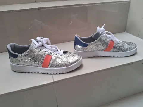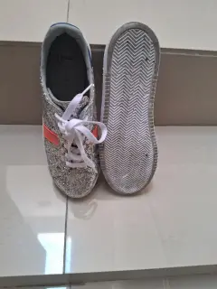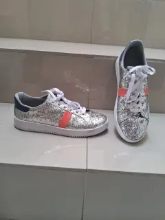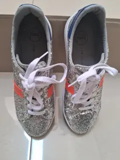 Tenis plateados con brillo. Marca Lob. Talla 26, pero quedan desde un 25.5 MX. Con brillos (brillantina). Muy poco uso. Sin detalles. Padrísimos!