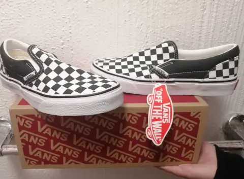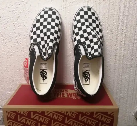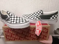 Vans Classic Slip-On. Tenis Vans # 21, color blanco con verde botella, de lona antideslizante, cuellos acolchados, acentos laterales elásticos y suela de gofres.