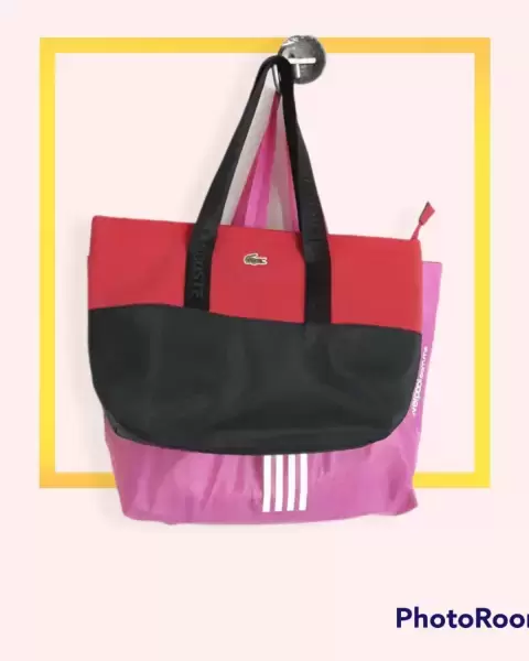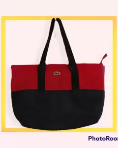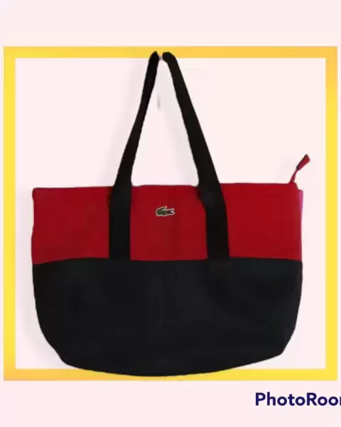 Bolsa de Lona Lacoste bicolor. Bolsa bicolor Rojo Negro, en perfecto estadoCon alas con logotipo eran relieveInterior con bosilloMedidas de bolso sin alas 45 x 30 cm
