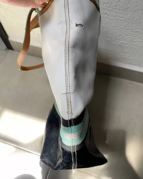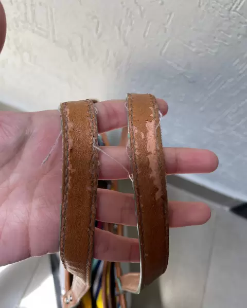Es una bolsa de uso, cuenta con algunos detalles, por dentro es de tela, tiene muchos compartimentos, por dentro está en buen estado.