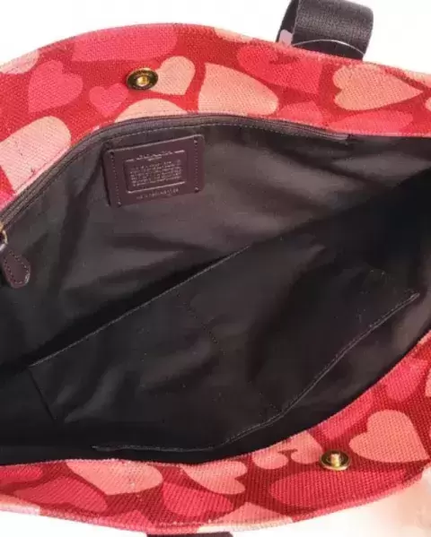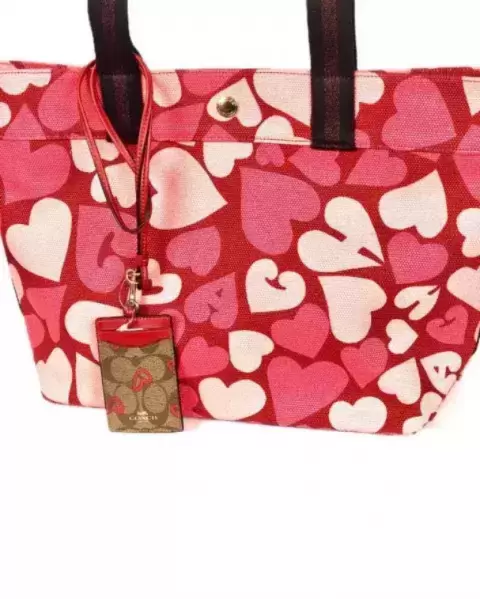 Monísima bolsa Tote Coach en color rojo y corazones en tonos rosas, cierre de botón, tiene espacios con cierre al interior es amplia y muy linda. Original y nuevecita con etiqueta. NO INCLUYE EL PORTA TARJETAS.