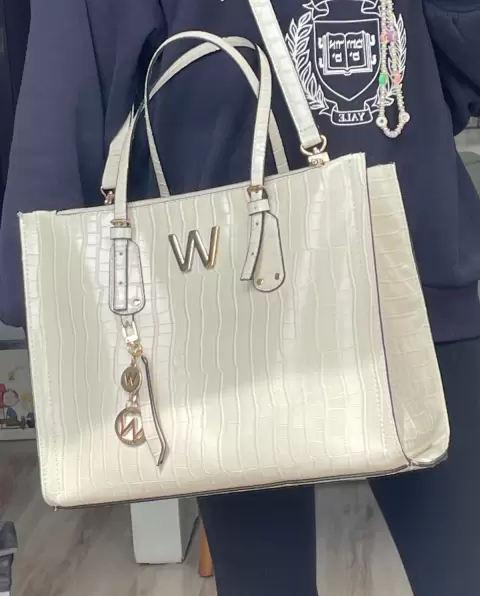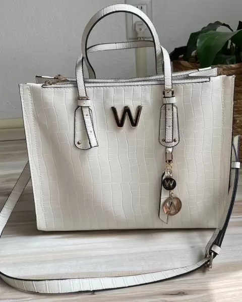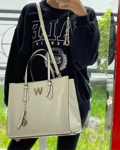 Bolsa Tote y porta laptop WESTIES. Bolsa tote color blanco/marfil, con llavero de la marca. Tiene 34 cm de largo, 15 cm de ancho y 29 cm de alto. (Demostración de uso: últimas 2 fotos). precio en tienda: $2,399.