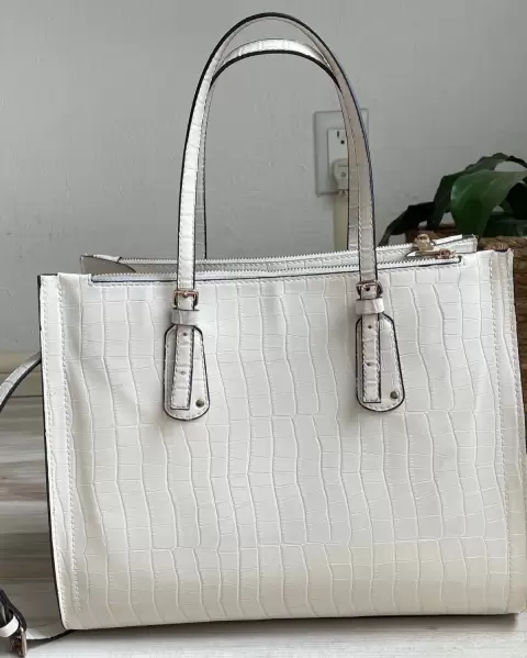 Bolsa tote color blanco/marfil, con llavero de la marca. Tiene 34 cm de largo, 15 cm de ancho y 29 cm de alto. (Demostración de uso: últimas 2 fotos). precio en tienda: $2,399.