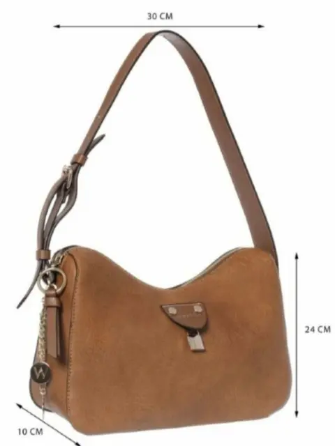 Preciosa bolsa color café, aplicación de borla, estampado liso, con cierre, correa ajustable, adorno metálico desprendible y forro textil. Super fashion. Medidas de la bolsa en la foto. 👜🧡💖