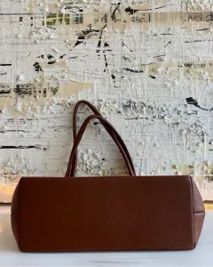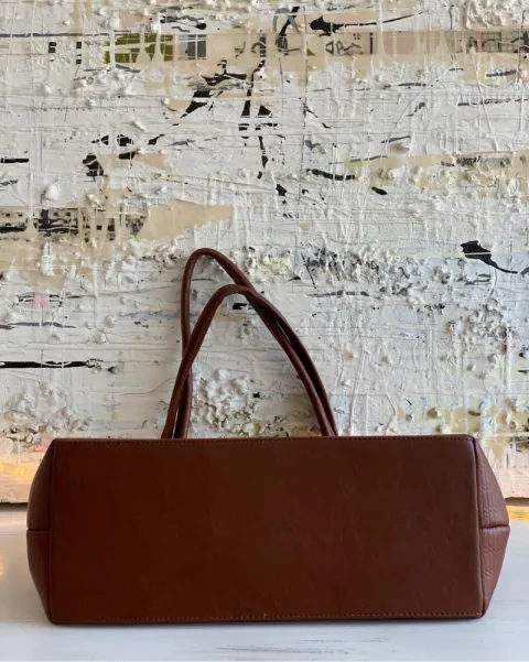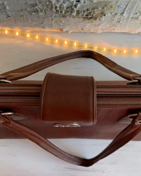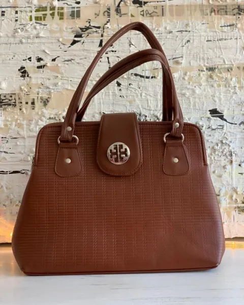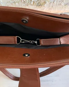 Bolso café con asas. Bolso con asas. Hecho en piel. Color café. Con dos cierres y un broche para cerrar. Por dentro compartimentos con cierre.