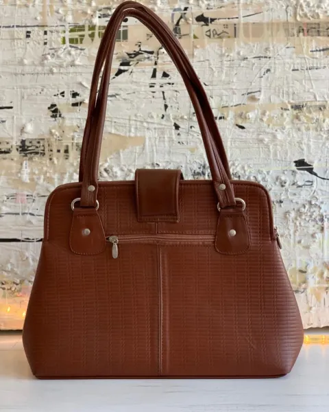 Bolso con asas. Hecho en piel. Color café. Con dos cierres y un broche para cerrar. Por dentro compartimentos con cierre.