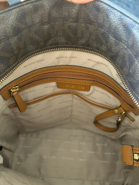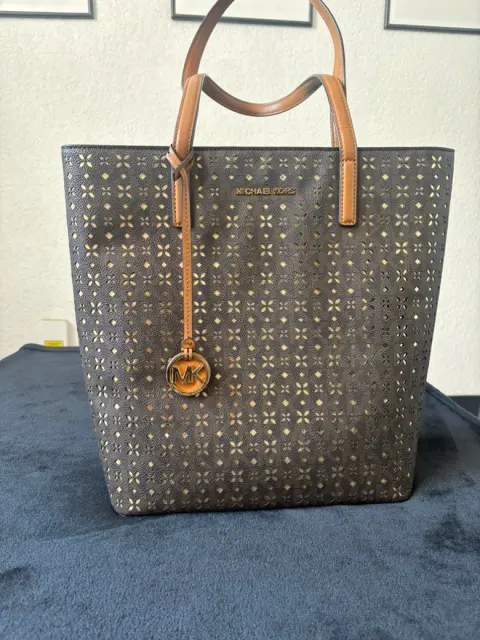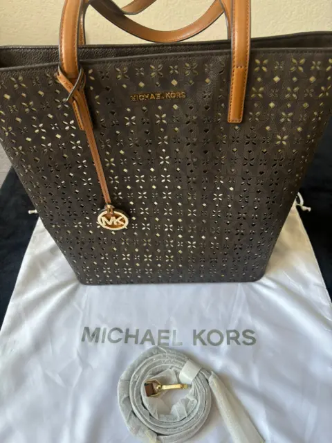 Bolso Michael Kors nuevo y original. Diseño práctico y elegante con fondo dorado y calado en café asas y correa de piel. Medidas altura 34 cm ancho 30cm y se ensancha hasta 35 cm y profundidad 12 cm.