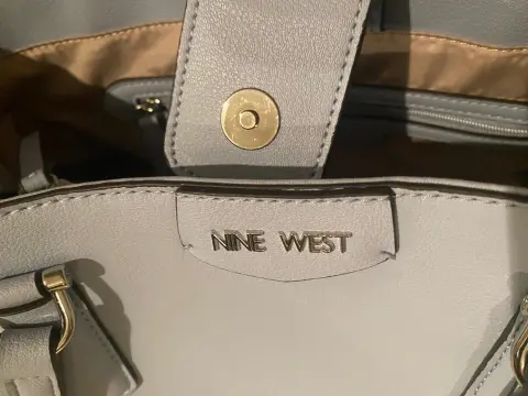 Bolsa satchel nine west para mujer elaborado en material vinil con aplicación lisa, estampado liso, fijación de imán y textura lisa, múltiples compartimentos y porta credenciales.
