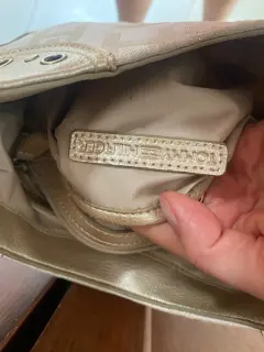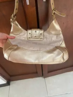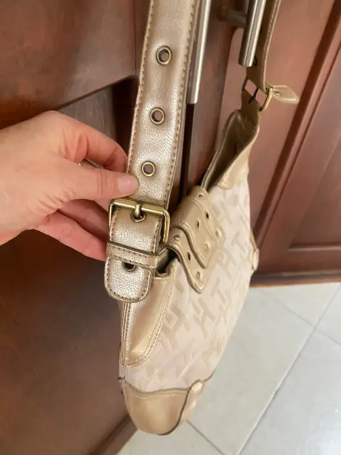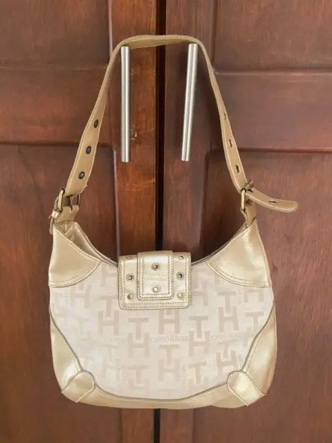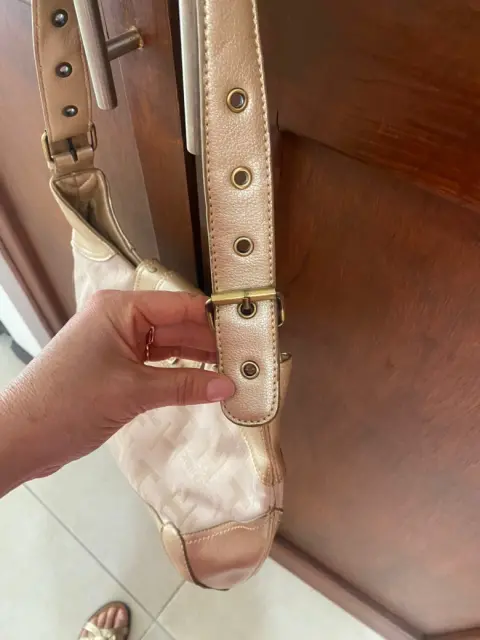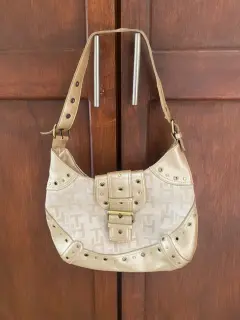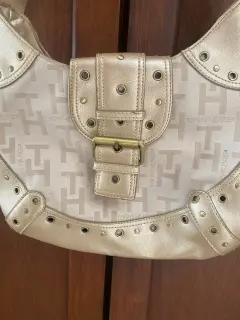 BOLSO TOMMY HILFIGER DORADO. Súper linda, practica, le caben muchas cosas Le falta un cintito del asa pero no afecta para nada su uso, tiene bolsitas internas Todo le funciona Perfecto