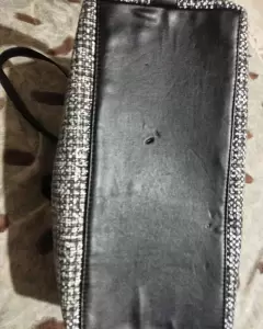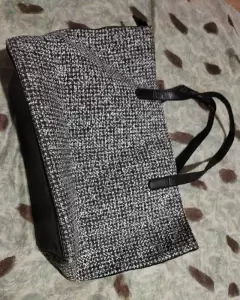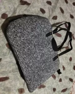 Hermosa bolsa, muy amplía diseño en tela jaspeada, en buen estado, con asa larga color negro..