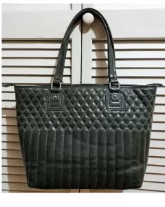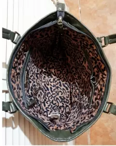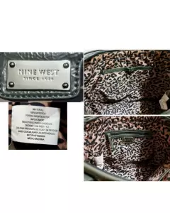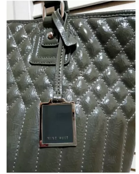 Elegante bolsa tote Nine West en material sintético color gris, acabado tipo charol. Con un diseño de líneas verticales y rombos, con tag gris con borde plateado. Las asas inician on un estoperol circular y argolla rectangular plateados. Interior tela estampado animal print, con 2 compartimentos con orilla de vinipiel gris, del otro aldo bolsa con cierre y decorado de vinipiel gris y una placa plateada con el nombre de la marca. Medidas: 40 cm. largo x 38 cm. alto. Impecable, SIN DETALLES. Hermosa, práctica y con mucho espacio.