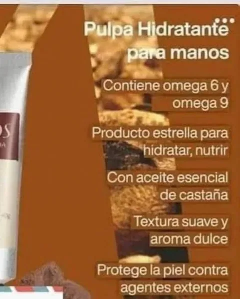 Pulpa hidratante de manos. PULPA HIDRATANTE CASTAÑA💖🌿𝗣𝘂𝗹𝗽𝗮 𝗵𝗶𝗱𝗿𝗮𝘁𝗮𝗻𝘁𝗲 𝗽𝗮𝗿𝗮 𝗺𝗮𝗻𝗼𝘀•Hidrata y reduce las cutículas dejando la piel restaurada, nutrida y las uñas con aspecto saludable. •Sin parabenos, sin siliconas y sin aceites minerales. •95% origen natural.📌Castaña -Realimenta la piel- antiresequedadPotente en realimentar la piel combatiendo los signos intensos de resequedad.Piel profundamente nutrida y revitalizada.