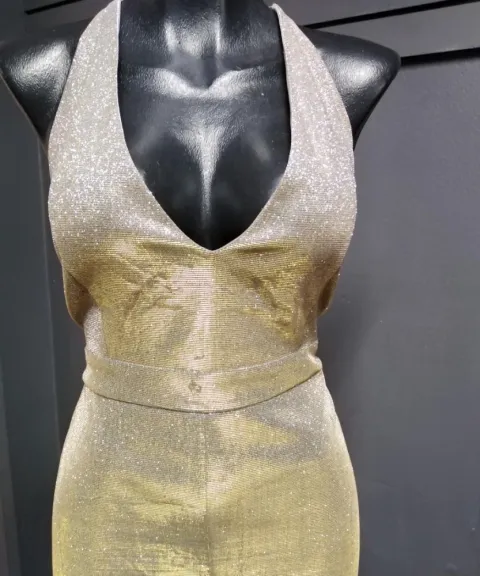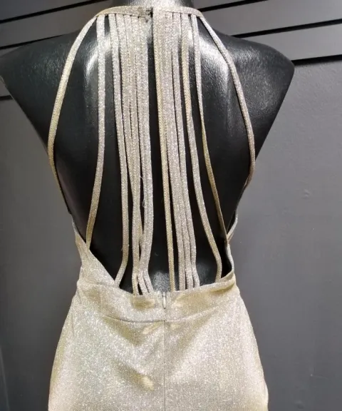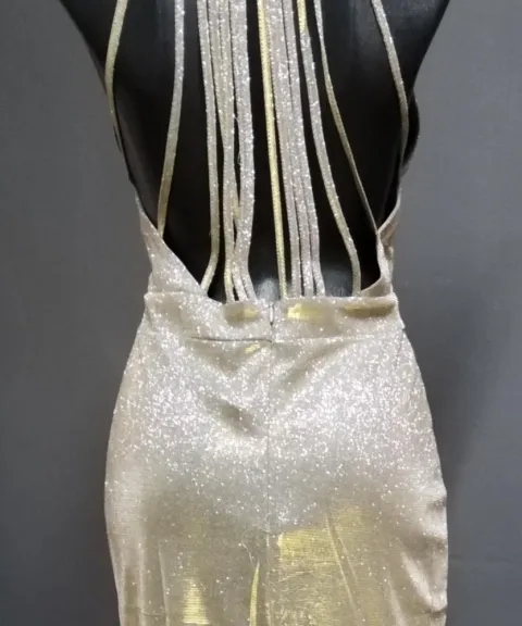 Vestido largo color dorado ,tela glitter torna sol ,abertura entre pierna ,sin mangas ,con tirantes en la espalda . talla mediana : Busto de 92 cm a 96 cm Cintura de 76 cm a 80 cm Cadera de 100 cm a 104 cm