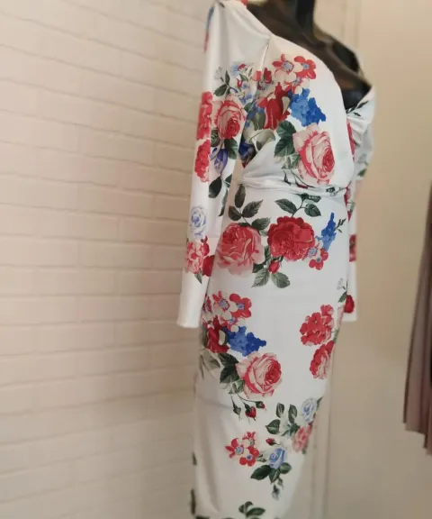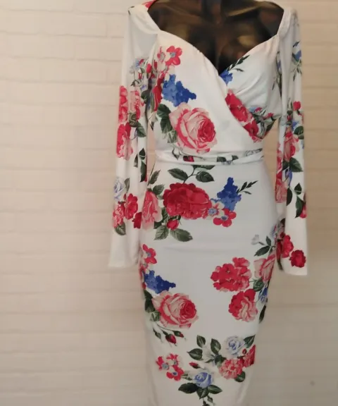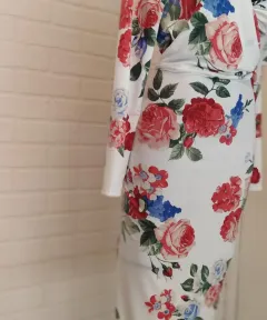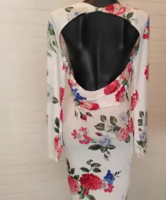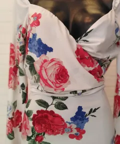 Vestido corto blanco con flores Corte cintura alta, largo de bajo de la rodillas, escote hombro caído, manga larga, escote en espalda alta, sujeta con un botón blanco, resorte al final del escote. el tipo de tela se estira. Talla G: Busto: 100cm a 104cm , Cintura : 84cm a 88cm , Cadera : 108 cm a 112 cm