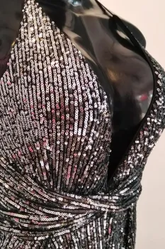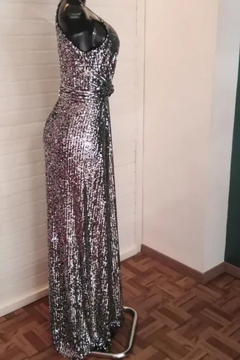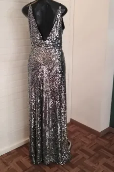 Vestido largo de lentejuela color plateado con negro, con tirantes, tiene un escote tipo "V" en la espalda y busto, tiene abertura en ambas piernas, cuenta con una tela de fondo tipo faja y tiene un cierre a la altura de la espalda baja. Talla. M; Busto de 92 cm a 96 cm Cintura de 76 cm a 80 cm Cadera de 100 cm a 104 cm