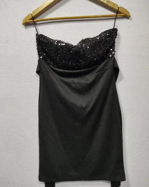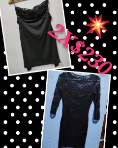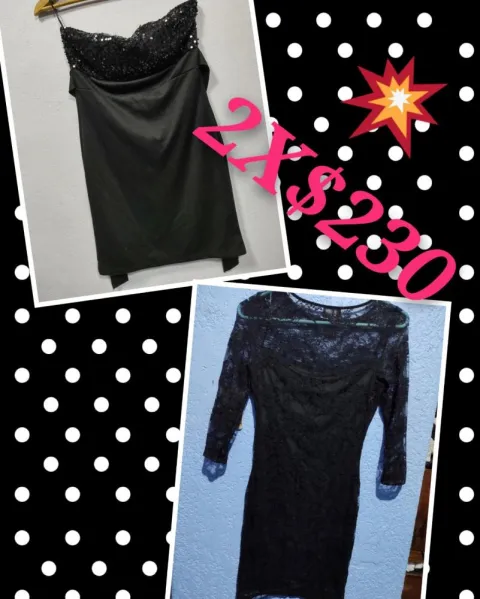 1)Bonito vestido negro strapless, corto. Con detalle en lentejuelas negras a la altura del busto. Con cintilla para amarrar en la espalda2) vestido corto, color negro de encaje, con forro integrado, manga 3/4 en perfectas condiciones.*****Ambos talla chica*****