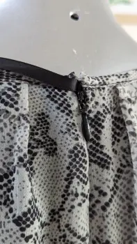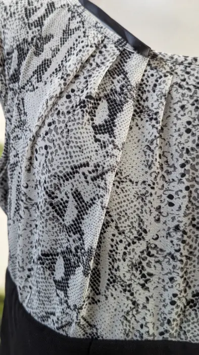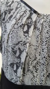 Cuello redondo gris forrado con vestido negro plisado en la parte inferior. Banda de cintura alta . ajustado justo debajo del corpiño. . Espalda con cremallera . Cuerpo 100% poliéster falda 97% poliéster y 3% spandex.