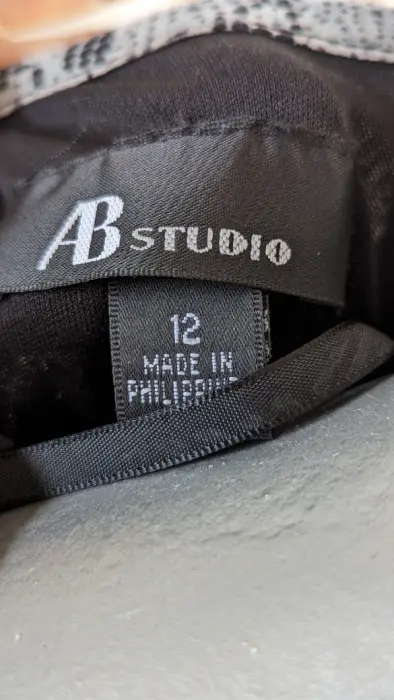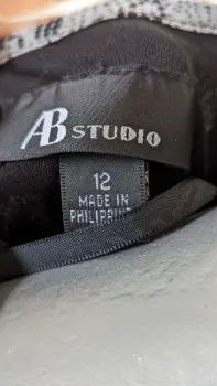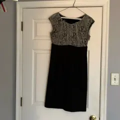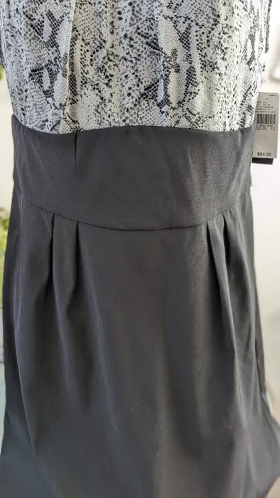 Abs studio vestido. Cuello redondo gris forrado con vestido negro plisado en la parte inferior. Banda de cintura alta . ajustado justo debajo del corpiño. . Espalda con cremallera . Cuerpo 100% poliéster falda 97% poliéster y 3% spandex.