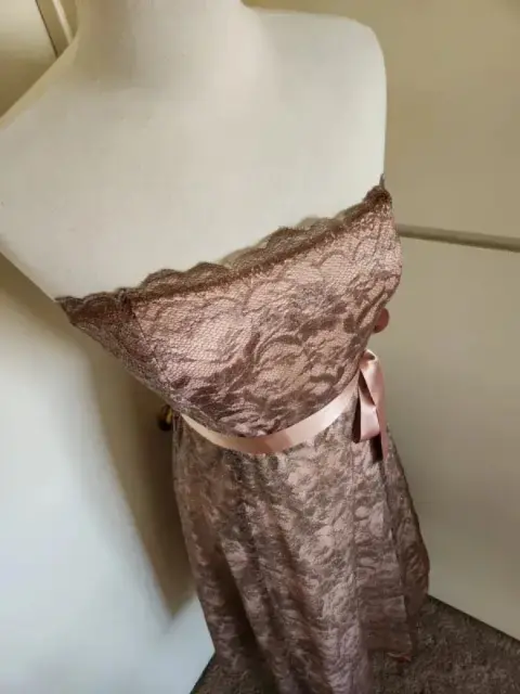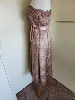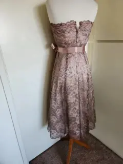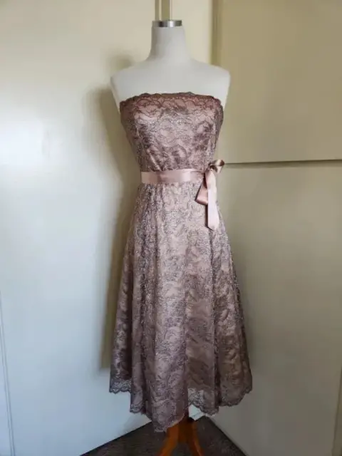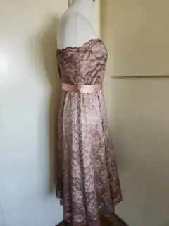Vestido de encaje en color gris con acentos en color oro rosado, sin tirantes, midi, cinturón satinado, Usado en Excelente Condición, Talla 2