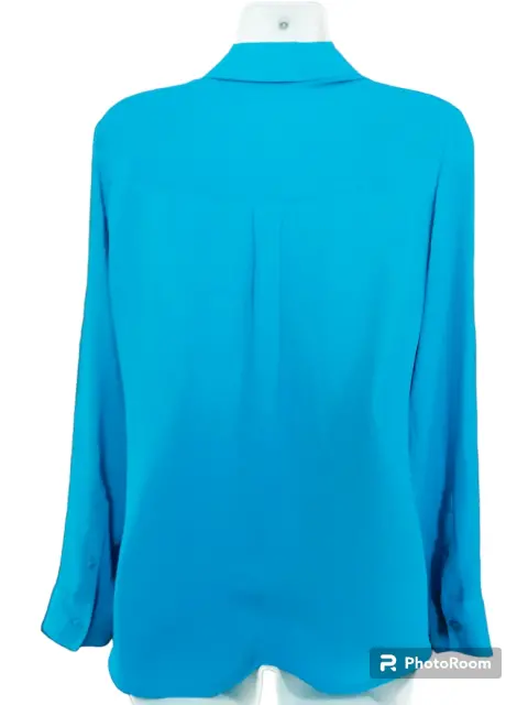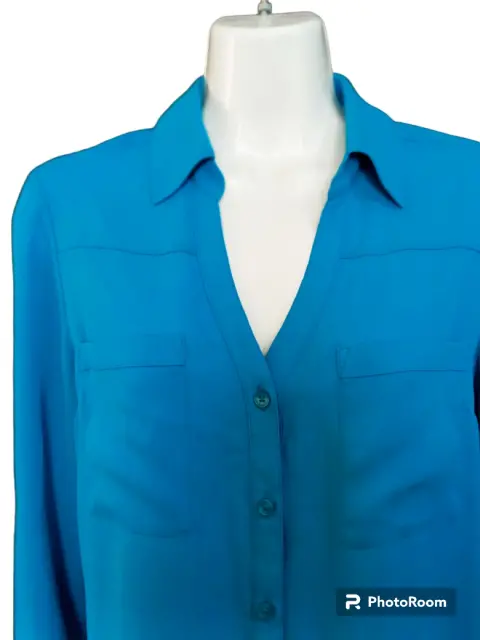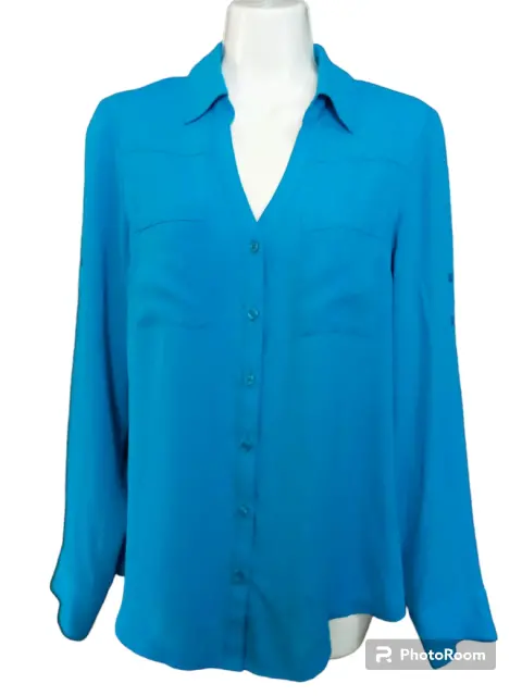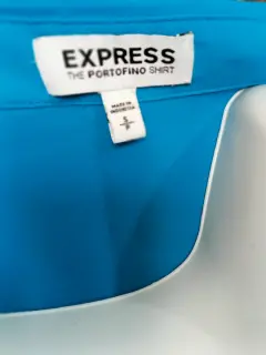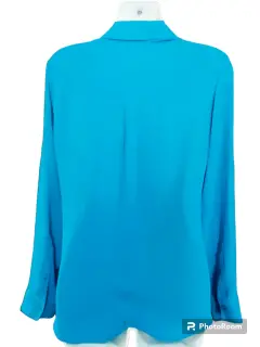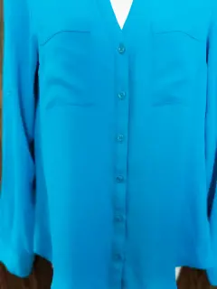 Blusa cuello en V azul claro. Vestido largo, beige, fresco, cuello en V, botones redondos, encaje al pie del vestido, cierre al costado.