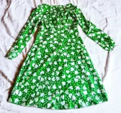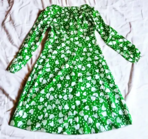 Precioso vestido con Estampado de corazones en blanco, escote con feuncido estilo corazón que resalta tu busto, manga larga con volante.Cintura 38cm, axila a axila 45cm, hombros 39cm y largo 98cm.