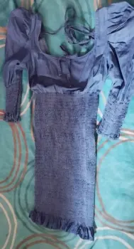 Bonito vestido de mezclilla.. Vestido de mezclilla azul. Hombros abultados y de cintura hacia abajo ajustado a tu silueta.