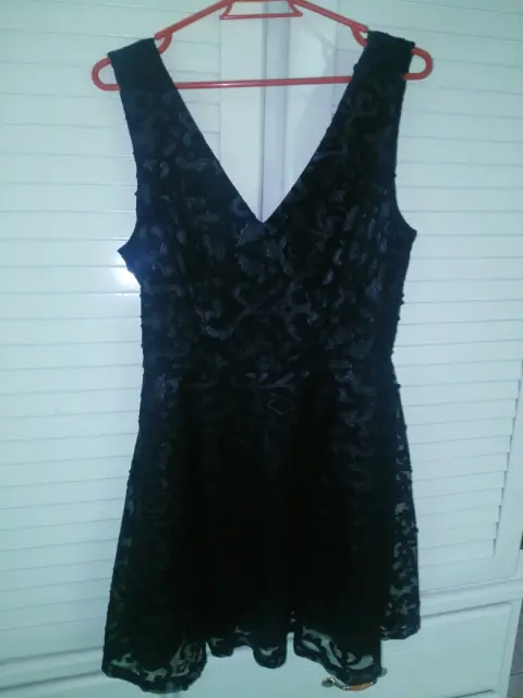 Bonito vestido negro Just me. Bonito vestido Justo me, corto, confeccionado en encaje con aplicaciones tipo piel cosidas, tul para vuelo y forro poliéster, corte en V frente y espalda, sin mangas, cierre invisible, talla grande.