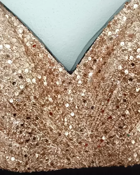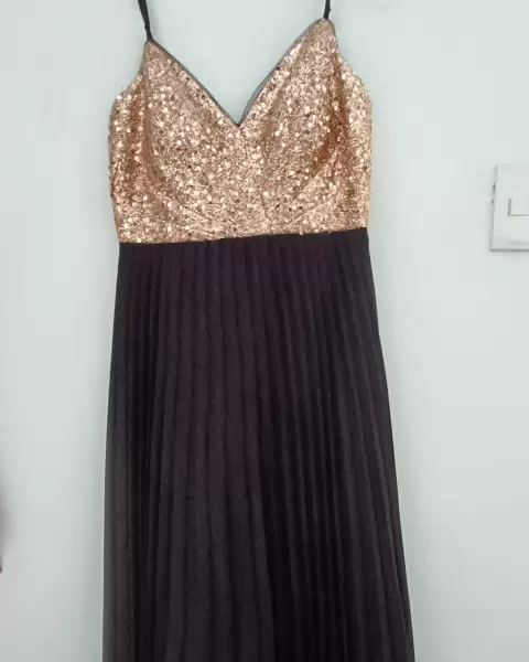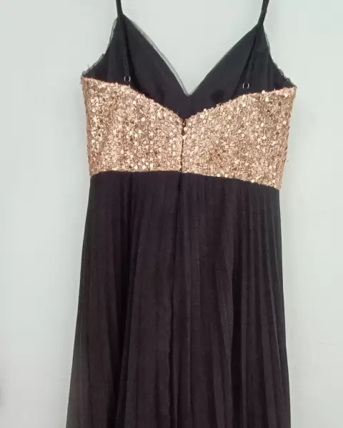 Brillante y elegante vestido largo. Hermosísimo vestido largo hasta el piso, lentejuelas doradas en la parte de arriba, el faldón es tableado, cierre en la parte de atrás de la prenda, tirantes ajustables y tiene forro, su caída queda súper bonita.