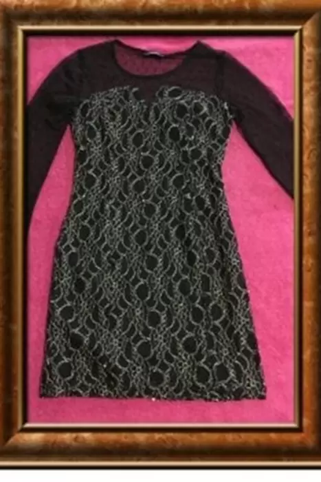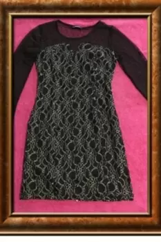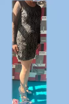 vestido corto de encaje dorado con fondo negro, es de manga larga, debido al encaje la prenda no estira mucho, las zapatillas son talla 5, la medida aproximada del tacón es de 12cm.