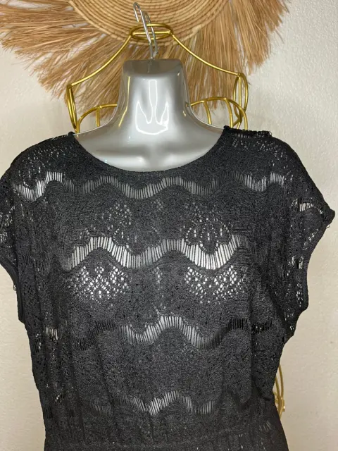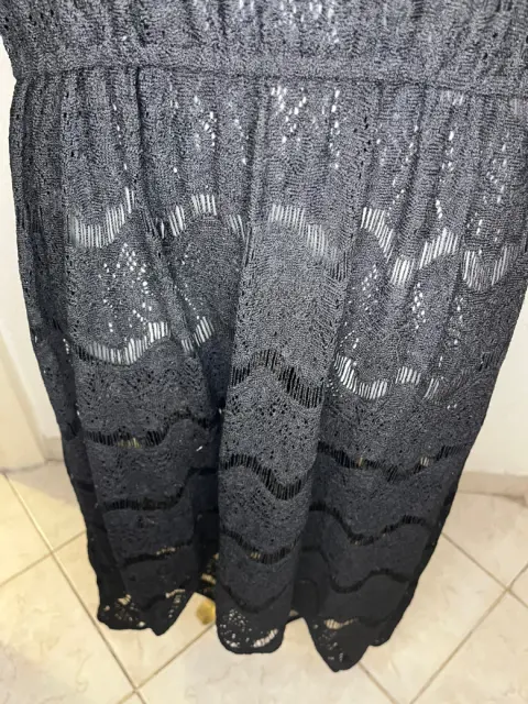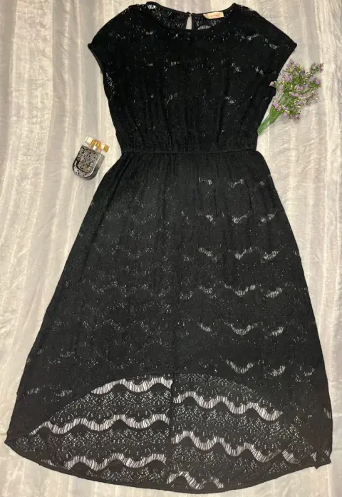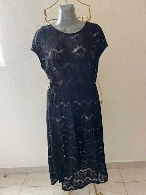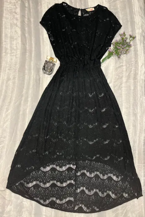 Elegante vestido de encaje marca mía de Andrea,Con resorte que remarca la cintura, asimétrico con cola de pato.El vestido desde un inicio se vendió sin forro lo que lo hace versátil ya que puedes juzgar con diferentes fondos o incluso con traje de baño.