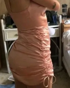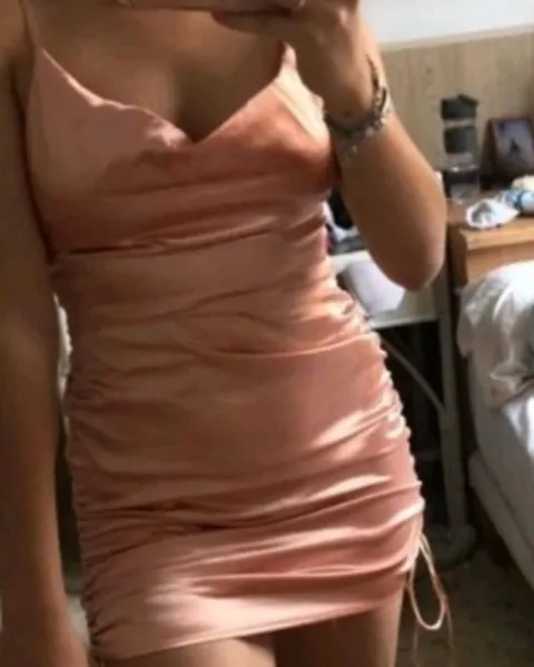 Elegante vestido de satén ideal para cualquier ocasión, de cuello redondo, tirantes y cintas a los costados. Color oro rosado de talla grande. 💕