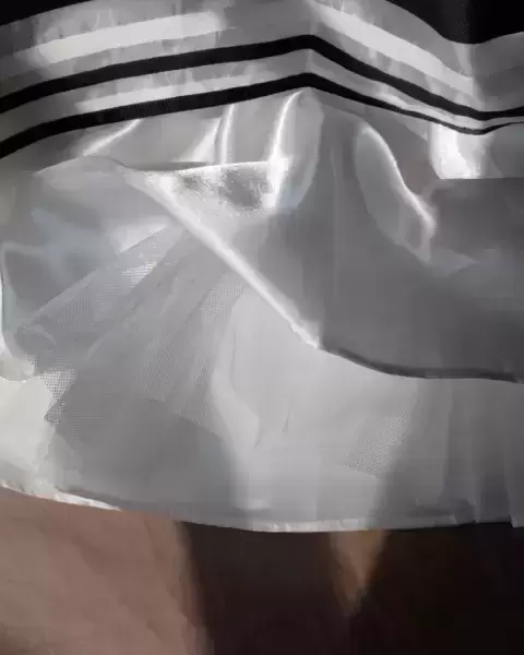 Hermoso vestido blanco a rayas beige y negras con crinolina y moño negro. Ajustable en la parte trasera